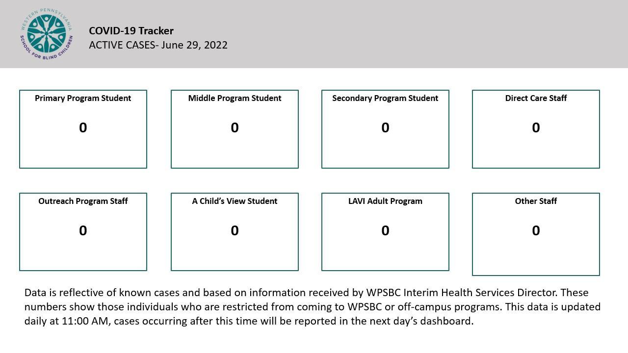 Data is reflective of known cases and based on information received by WPSBC Health Services Director. These numbers show those individuals who are restricted from coming to WPSBC or off-campus programs. This data is updated daily at 11:00 AM, cases occurring after this time will be reported in the next day’s dashboard.